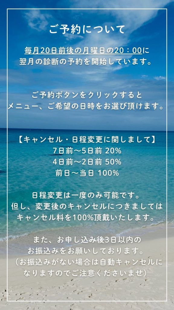 紹介者様のお名前をお伝え頂けましたらご紹介特典として、上記開始日を待たず随時お受けしますので診断のご希望日を直接LINEを頂ければと思います。